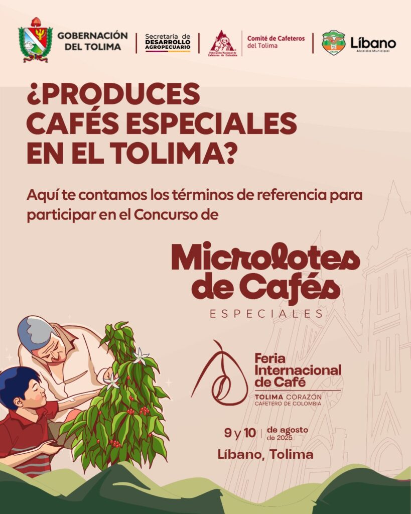 Ibagué, mayo 21, 2025 – El Tolima se prepara para celebrar uno de los eventos más importantes del calendario cafetero nacional. Se trata de la tercera versión del Concurso Departamental de Microlotes, organizado por la Gobernación del Tolima y la Federación Nacional de Cafeteros – Comité de Cafeteros del Tolima, que este año tendrá como sede el municipio de El Líbano, tradicional epicentro de la caficultura en el norte del departamento.