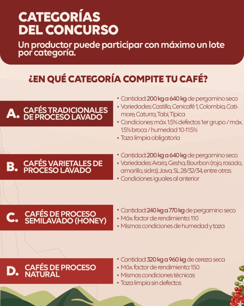 La Directora del programa de Cafés Especiales del Comité, Juana María Montealegre, explicó que en esta versión del concurso se premiarán cafés en cuatro categorías: lavados tradicionales, lavados varietales, honey y naturales. “Los participantes deben ser productores del Tolima inscritos en el Sistema de Información Cafetera (SICA), y cumplir requisitos técnicos como un máximo del 1.5% de broca, humedad entre 10% y 11.5%, y factores de rendimiento específicos por categoría. Queremos visibilizar los cafés de alta calidad que se producen en el departamento”, señaló.