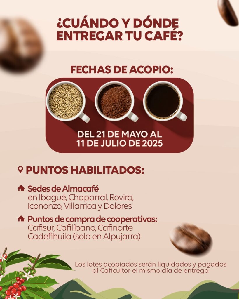 El acopio de lotes inició el 19 de mayo y se extenderá hasta el 11 de julio en cooperativas, con fecha límite para entrega a Almacafé el 14 de julio. Para mayor información, los interesados pueden comunicarse con el Servicio de Extensión Rural del Comité de Cafeteros del Tolima o consultar los canales oficiales de la Gobernación del Tolima.